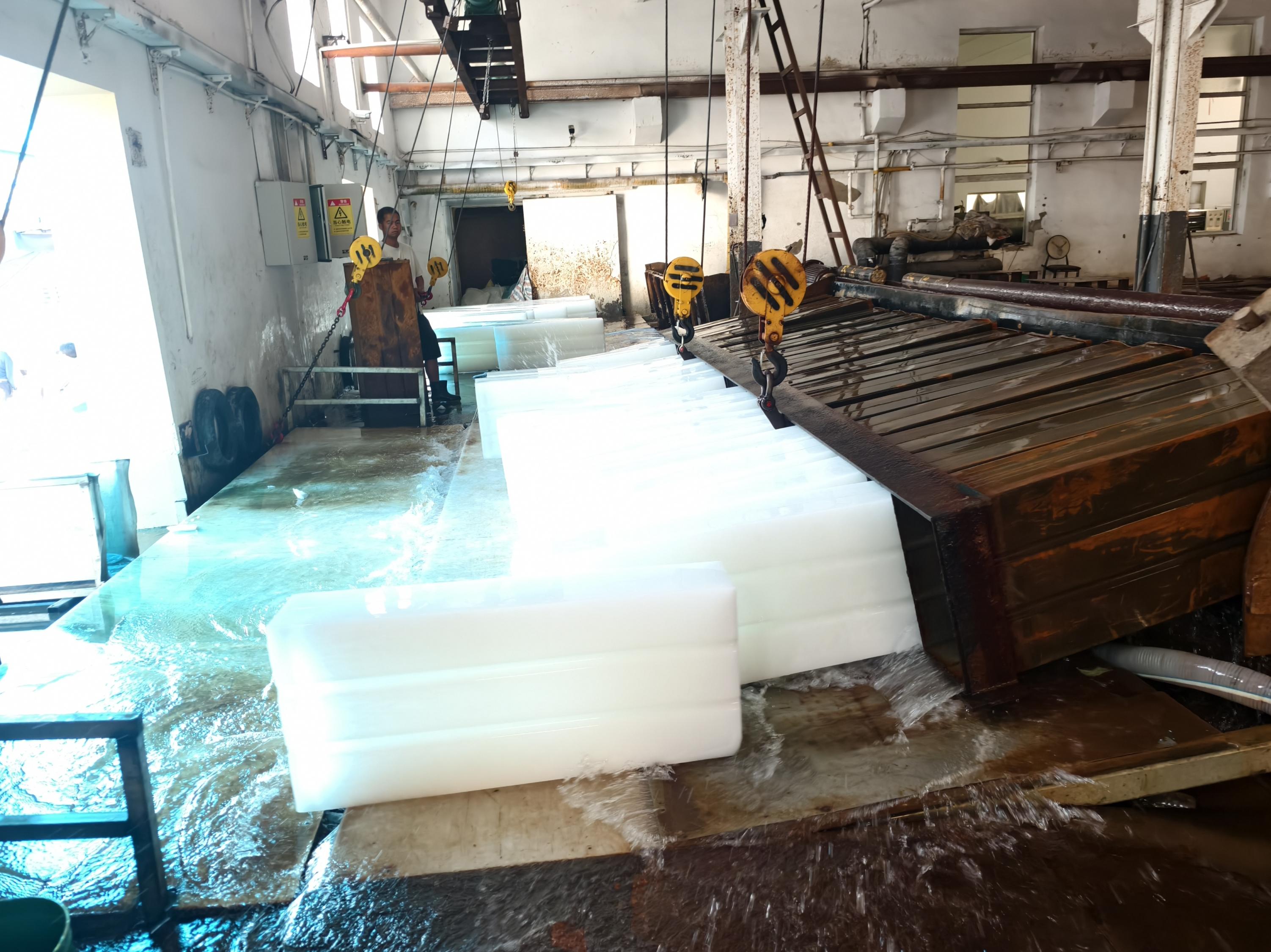 走进制冰车间,正好赶上一排制冰设备出冰,只见这排超级大的设备由18个一米多高的制冰盒组成,在吊钩的牵拉下,来到出冰池上方。随即吊钩将制冰盒沉到水池中左右摇晃“洗冰”,一个个洁白的冰块就浮了起来。随后吊钩将冰盒吊起,倾斜,冰块们就冲了出来,水花四溅。