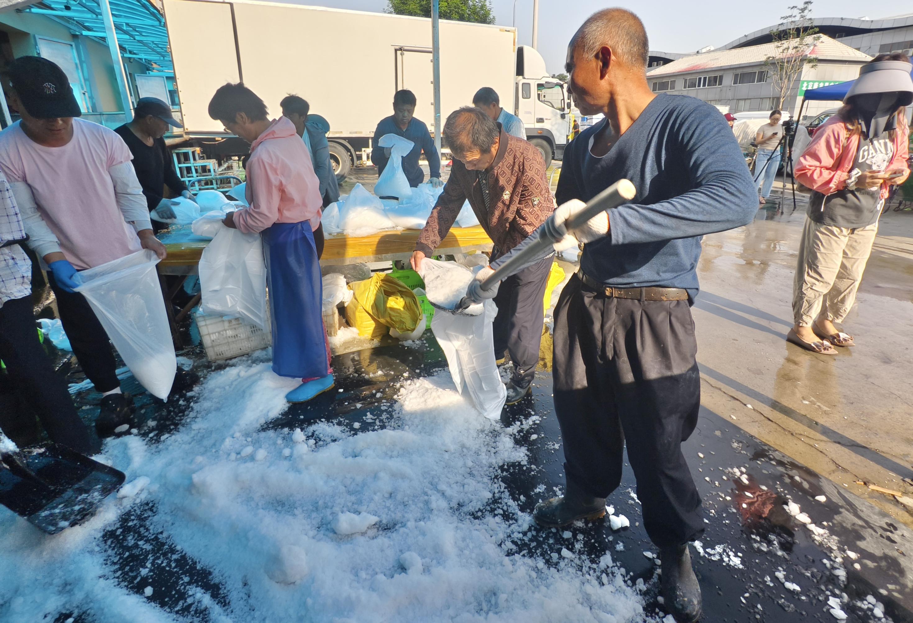 “每天得装近2万袋!”碎冰操作区,大冰块被不停地推进碎冰机里,七八个工人在装冰,整理冰袋。旁边,一位经营香葱的商户正在分装。只见他先将香葱放在筐里,一筐19斤,随后铺上一层吸水布,再在布上加上冰袋。“香葱是从大兴地头拉进来的,在这里分装,加冰,送到城里哪儿都不怕蔫巴了!”